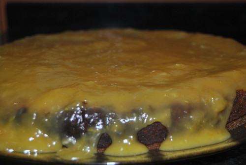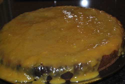 Leve ao lume todos os ingredientes com exceção dos ovos. Deixe levantar fervura. Bata os ovos e, após a mistura arrefecer, junte-os lentamente. Leve novamente ao lume até levantar fervura e vá mexendo sempre, durante 5 minutos. Desligue e quando estiver morno, cubra o bolo.