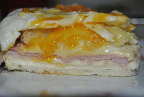 Num tabuleiro de ir ao forno disponha uma fatia de pão de forma, cubra com duas colheres de molho bechamel. Coloque duas fatias de fiambre, duas fatias de queijo. Termine com outra fatia de pão de forma, cubra novamente com mais duas colheres de sopa de molho bechamel e polvilhe com o queijo ralado. Leve a forno pré-aquecido a 180º e deixe por cerca de 5 minutos. Enquanto o pão está no formo estrele um ovo. Retire o pão do forno, coloque por cima o ovo tempere-o com sal e pimenta et voilá! Está pronto a servir!
