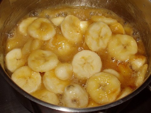 Corte as bananas em rodelas e leve ao lume com o vinho do Porto, o açúcar amarelo, deixe ferver um pouco.