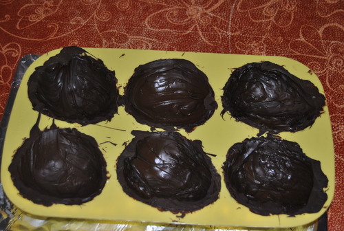 Coloque uma colher de sopa de chocolate dentro de cada forma e pincele para espalhar uniformemente o chocolate pelas paredes da forma.