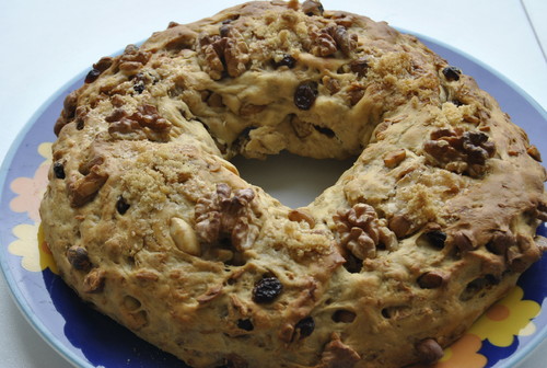 Retire e coloque numa superfície enfarinhada, molde um rolo e faça o formato do bolo rainha. Deixe levedar. Pincele com leite e decore com nozes e açúcar amarelo.