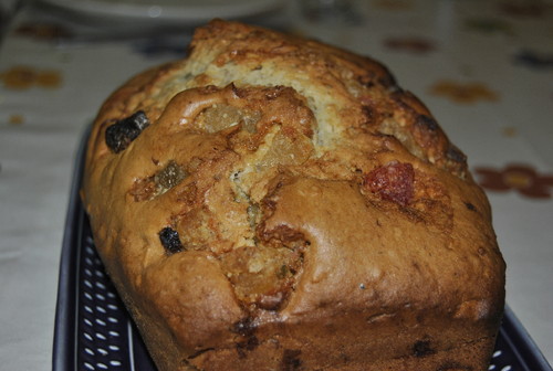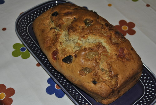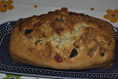 Pique 100g de frutas cristalizadas, envolva-as em farinha e reserve. Pique os frutos secos e reserve. Com a batedeira bata os ovos com o açúcar. Adicione a manteiga derretida e bata mais um pouco. Adicione o sal, a farinha, previamente envolvida com o fermento e o bicarbonato de sódio, e bata mais um pouco. Adicione as frutas cristalizadas e os frutos secos e envolva com uma colher de pau.