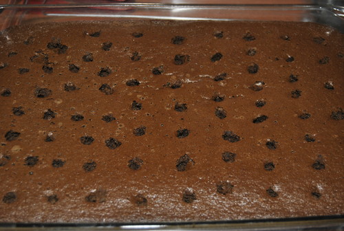 Quando o bolo estiver quase cozido, faça o pudim conforme as instruções da embalagem. Reserve quente. Assim que o bolo estiver cozido, com o cabo da colher de pau (ou algo da mesma grossura), e faça furos por todo o bolo até ao fundo do pirex, os furos devem ser suficientemente largos.