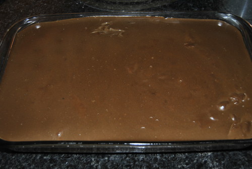 Deite o pudim bem quente por cima do bolo, preenchendo todos os furos. Deixe arrefecer e coloque no frigorífico, fica excelente depois de frio!