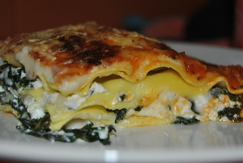 Num pirex que irá levar ao forno coloque o molho de tomate no fundo, cubra com uma folha de lasagna, coloque uma camada de requeijão e espinafres e regue com um pouco de béchamel. Coloque outra folha de lasagna e repita até terminar com uma folha de lasagna. Cubra com o restante béchamel e de seguida espalhe muito bem o queijo ralado.
