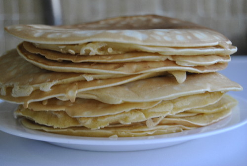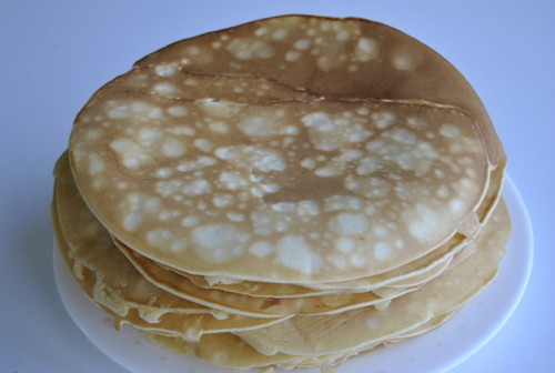 Unte uma figideira antiaderente pequena e verta uma colher grande (ou uma concha pequena) do creme, deixe espalhar no fundo da frigideira. Deixe dourar dos dois lados e retire para um prato. Repita até terminar o creme.