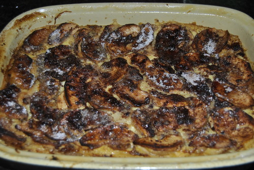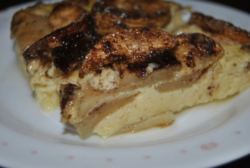 Corte as maçãs em tiras finas e coloque-as no fundo do tabuleiro préviamente untado. Polvilhe com um pouco de canela. Numa tijela misture bem o açucar e a farinha, junte os ovos e mexa, junte o leite. Mexa bem, sem bater. Deita-se a mistura por cima das maçãs e polvilhe novamenter com canela. Leva-se a cozer cerca de 45 minutos a 180º. Antes de estar cozido, espalhe a margarina em pedaços e polvilhe com o açúcar, vai novamente ao forno para acabar de cozer e para dourar.