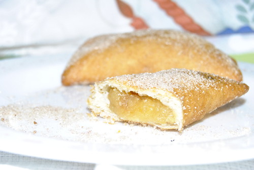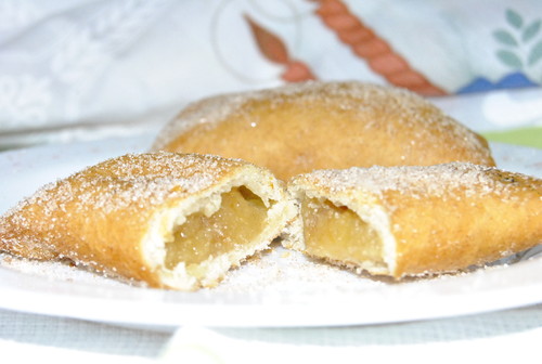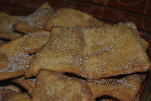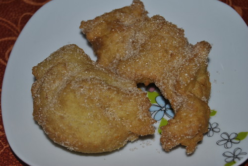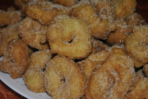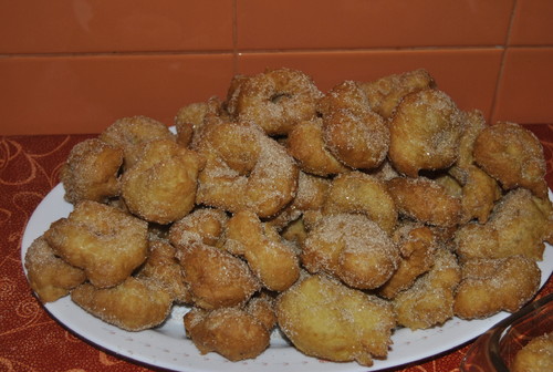 Com os dedos untados com azeite retire pedaços de massa, estique-os com as mãos e coloque no óleo bem quente. Depois de fritos coloque-os sobre papel absorvente. Polvilhe-os com açúcar e canela.