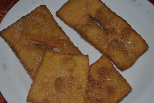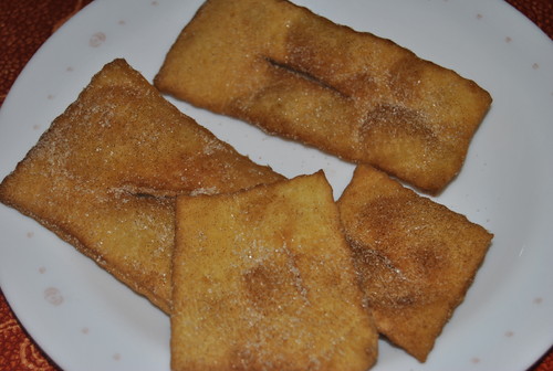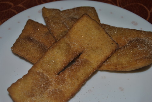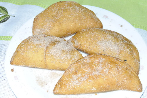 Frite-os em óleo bem quente e escorra-os sobre papel absorvente. Passe-os por açúcar e canela e sirva.