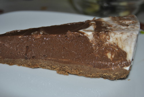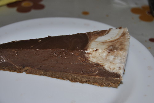 Derreta o chocolate no microondas com uma noz de manteiga e duas colheres sopa de leite. Separe a mistura dos iogurtes em duas partes iguais e adicione o chocolate derretido a uma delas. Coloque alternadamente as duas partes de chocolate na forma com a bolacha e com a ponta de uma faca dê-lhe o efeito marmoreado.