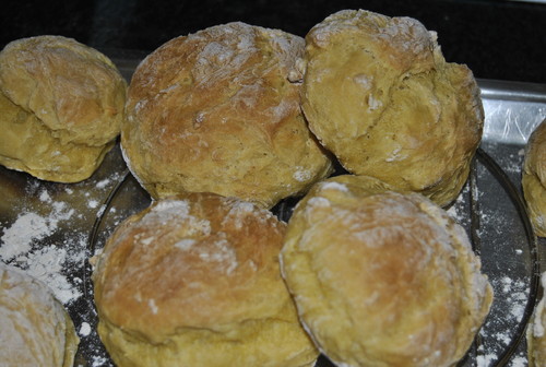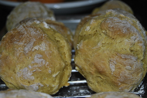Faça bolas e coloque num tabuleiro de ir ao forno polvilhado com farinha. Deixe elvedar masi 20 minutos. Leve ao forno, pré-aquecido a 180º durante cerca de 40 minutos.